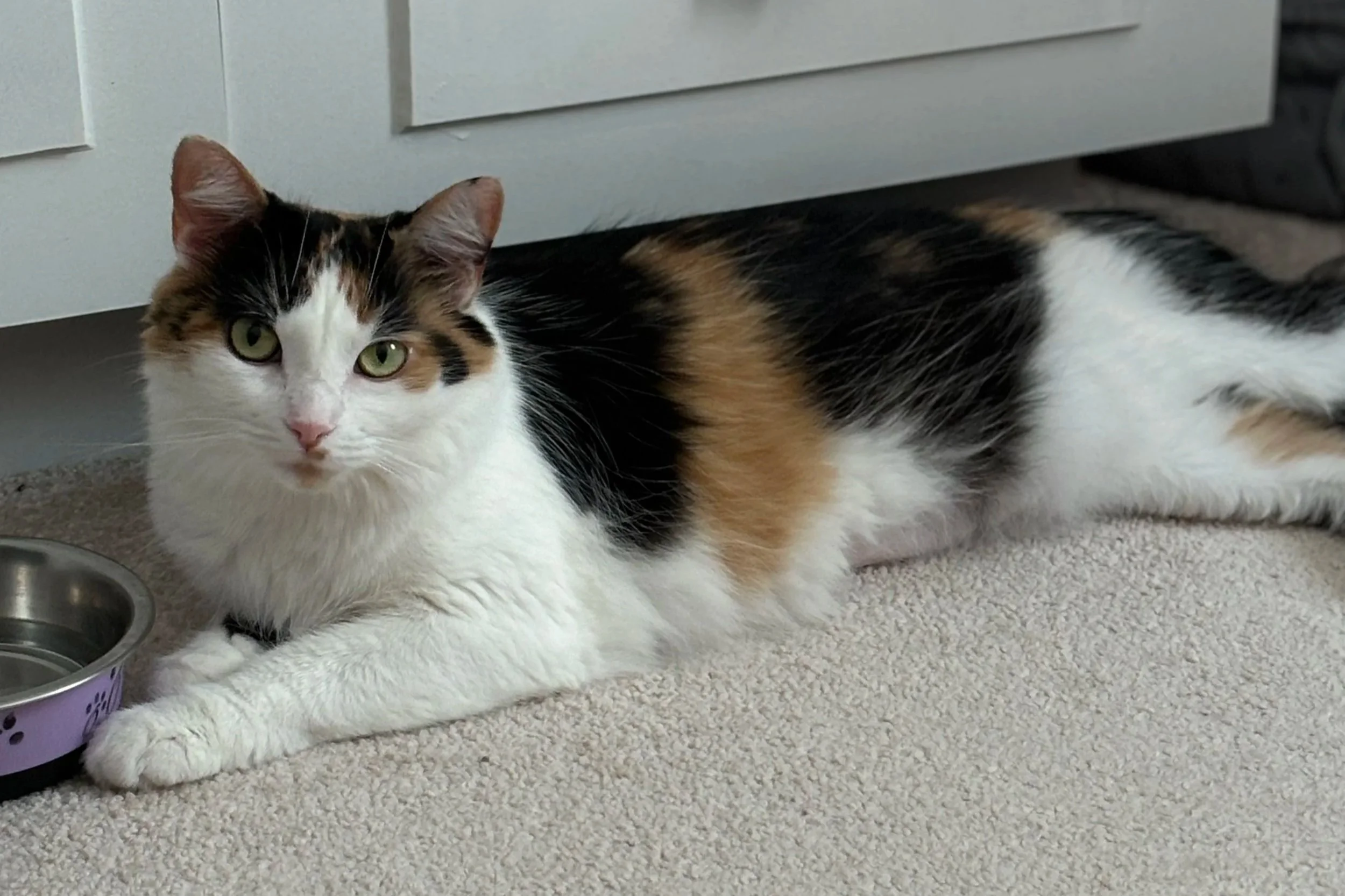 Chloe is an older cat who came to the shelter with two siblings. The siblings were adopted but Chloe was hostile and was designated to be a barn cat. It took a lot of patience but she eventually opened up and is now in a very loving home.