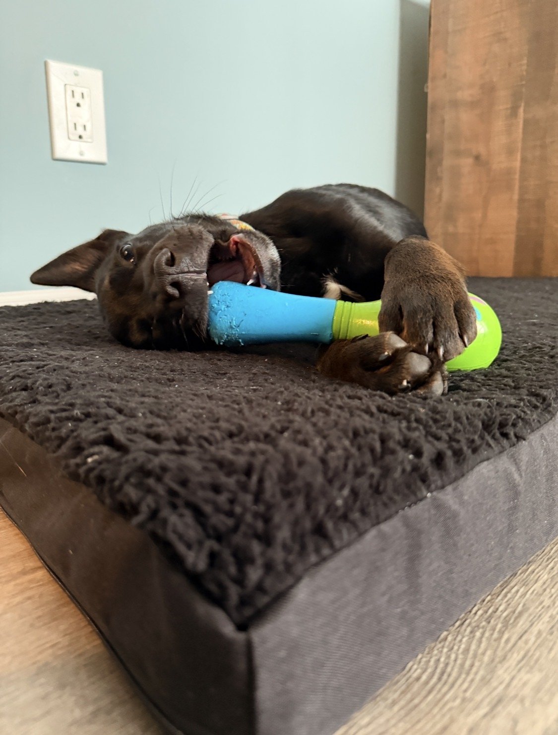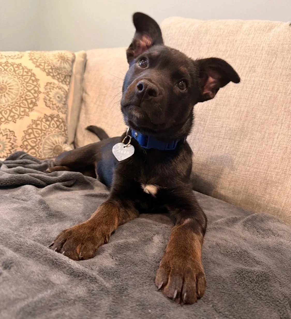 His playful nature shines through in his love for jumping and engaging in tug-of-war. He’s always inseparable, and you’ll often find him snuggling into one or both of us on the couch. We couldn’t imagine our lives without Scoop.”