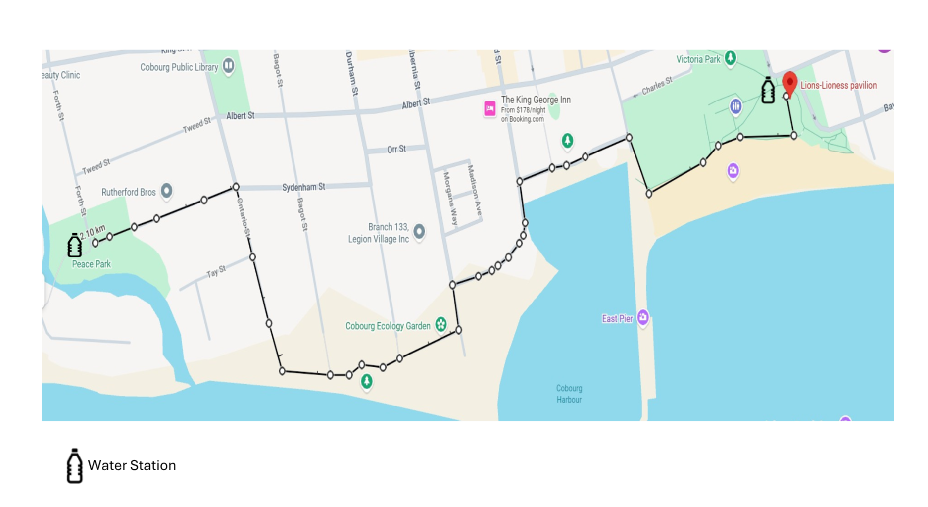🌈 The route continues past the marina, along the boardwalk to Ontario St. From there participants head up Ontario St to Clyde St and down to Peace Park, where there will be a water station for pets and people to stay hydrated!